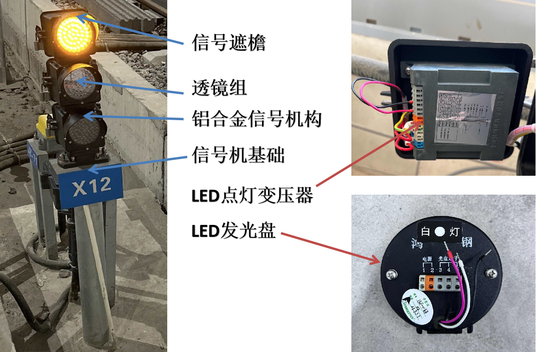 信号机主要由提供电压的LED点灯变压器、点亮不同灯源的LED发光盘、保护发光盘的透镜组、信号遮檐、支撑整个信号机的铝合金信号机构、信号机基础六部分组成。
