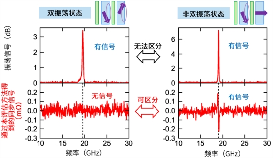 该方法着眼于STO振荡与评估用天线所照射微波之间的同步现象。同步现象的有无因STO振荡状态而异,特别是在双振荡型STO所追求的双振荡状态下,该同步现象不会出现。即使在传统测量中振荡信号无明显差异的情况下,该方法也能明确区分双振荡状态与非双振荡状态,从而阐明振荡状态(图2)。根据STO的振荡状态,可能会出现多个振荡信号,但由于可以在频率层面进行测量,因此可以确定出共振型微波辅助磁记录(MAS-MAMR)最佳振荡状态的真实频率。