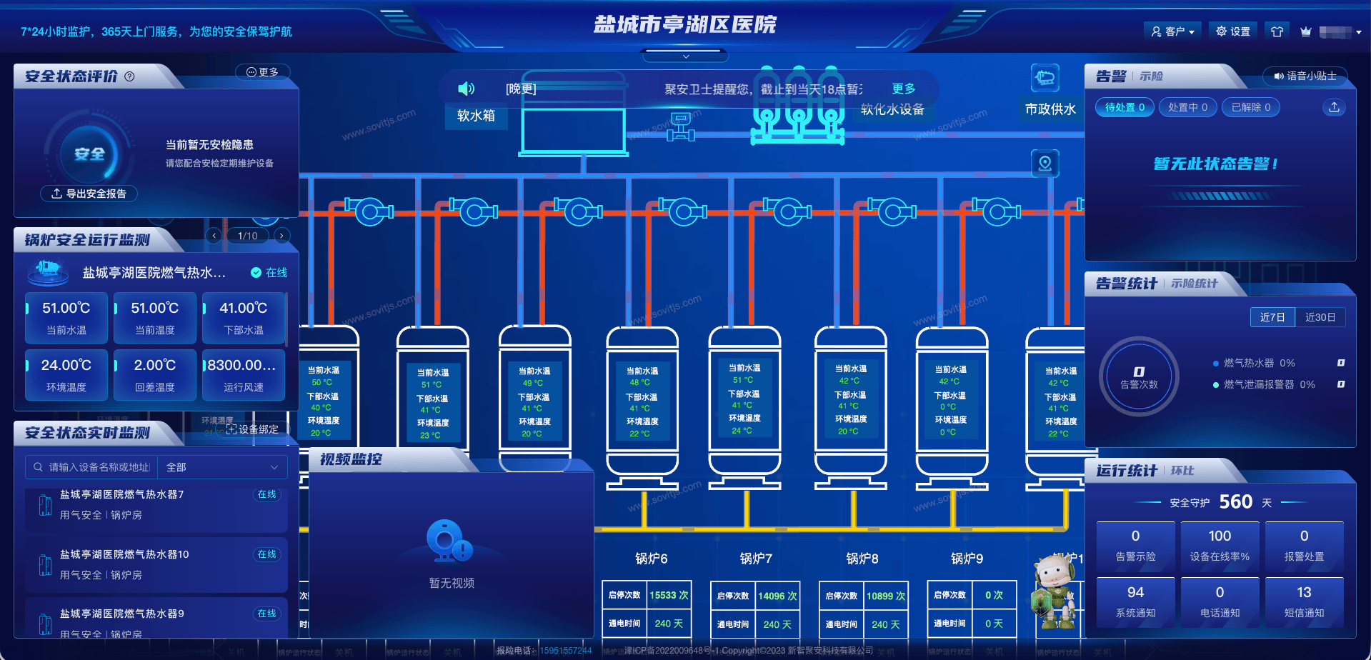 新智聚安以平台优势充分聚合盐城新奥燃气、物联设备供应商、智能算法服务商等多方生态伙伴,形成复合智能服务能力,并结合医院实际需求与现场场景特点,量身打造了涵盖燃气泄漏监测与锅炉安全运行管控的 “锅炉安全场景智能平台”,实现24小时不间断智能值守,可在安全风险初现端倪时秒级预警识别,化身默默坚守的“AI守夜人”。